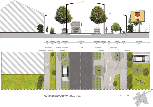 Le projet propose de restructurer la voirie afin de l’intégrer à la trame viaire de la ville et mettre en place une nouvelle liaison ouest-sud. Le travail s’est également concentré sur les autres modes de déplacement dans le but d'améliorer la continuité et le confort des circulations à vélo et piétonne, ainsi que la desserte des bus. Les aménagements de requalification du secteur visent à intensifier les occupations actuelles et à limiter l’étalement sur les espaces naturels encore présents.