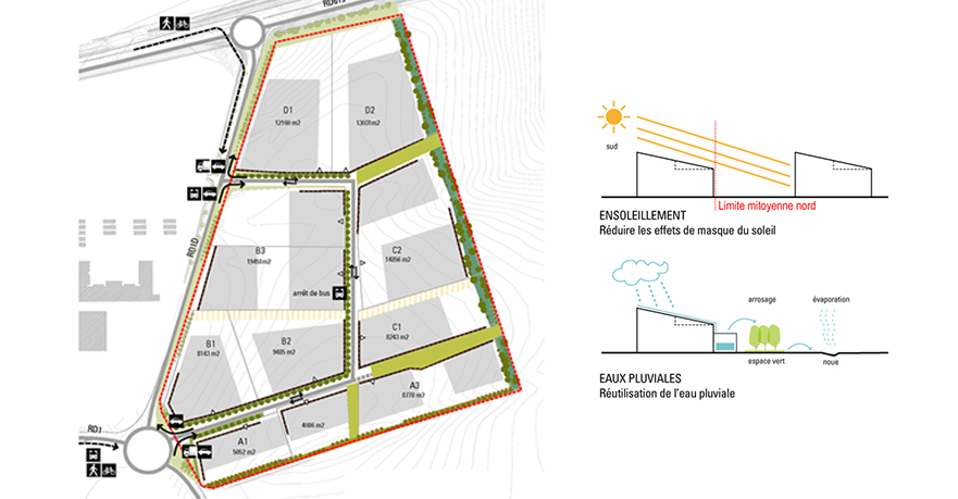 Le projet porte sur l’accessibilité à la ZAC, les programmes à mettre en oeuvre sur les espaces collectifs et le traitement des limites des lots. Les cibles environnementales sont également au centre du projet avec l’implantation du bâti et la gestion des eaux pluviales, qui s’effectue entièrement par des noues végétalisées sur le relief existant. Le plan de voirie est dessiné afin de permettre les extensions futures et d'éviter les impasses, alors que le découpage parcellaire est à géométrie variable.