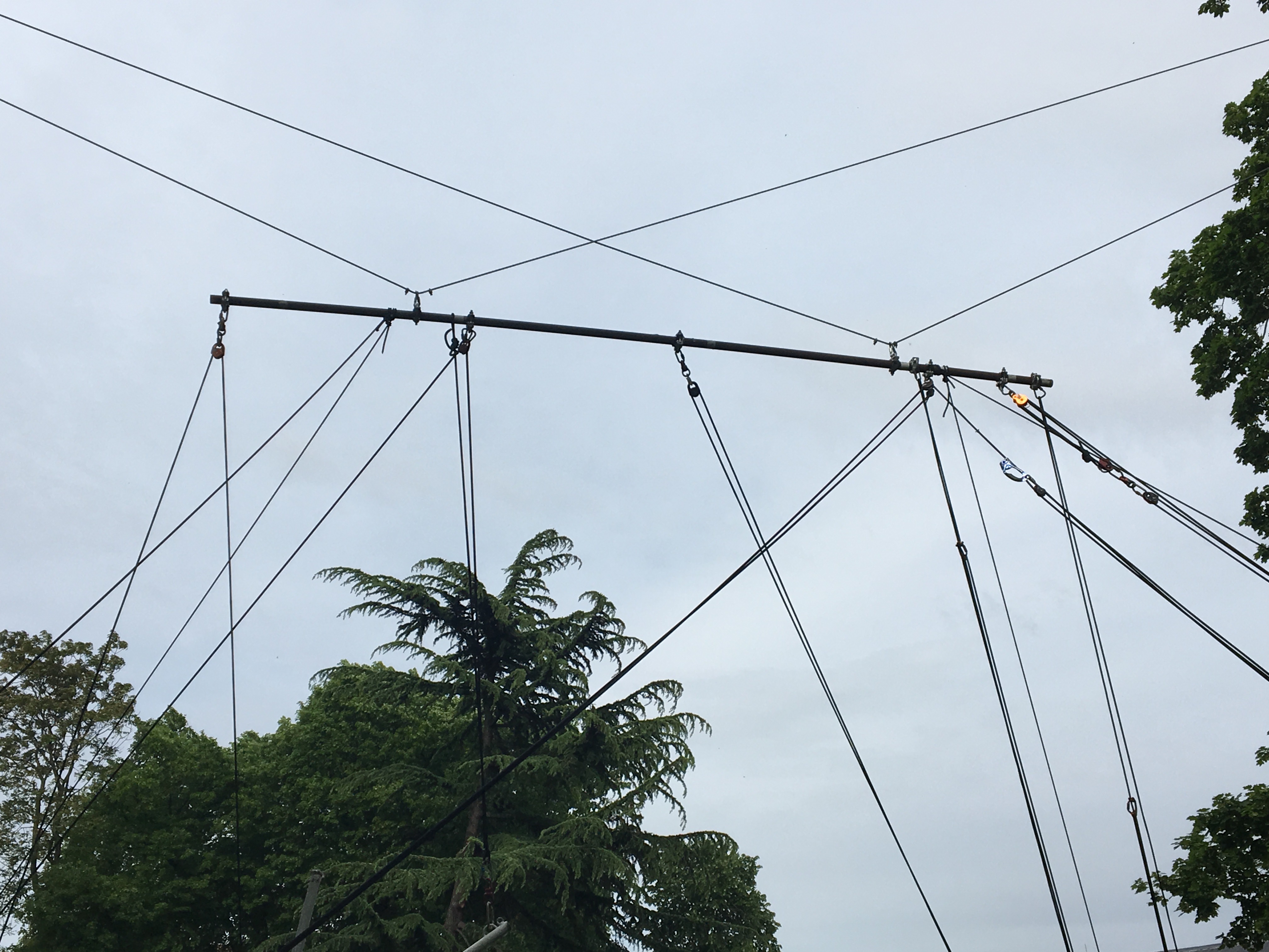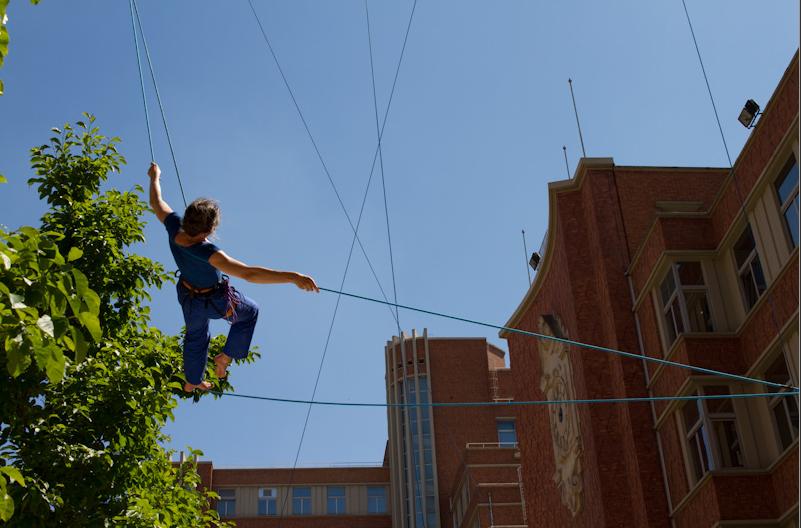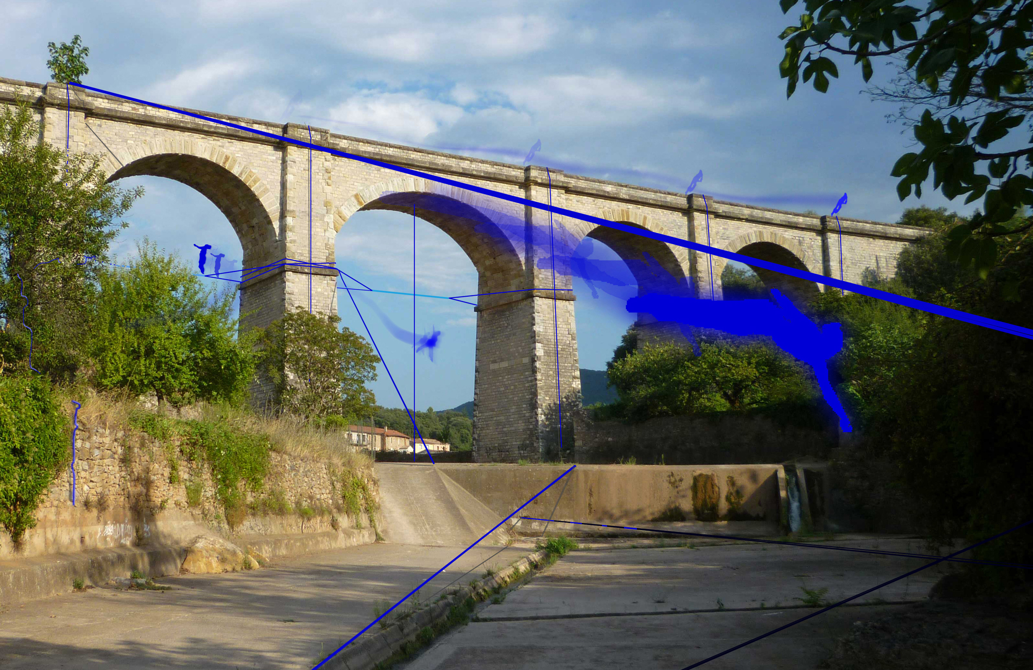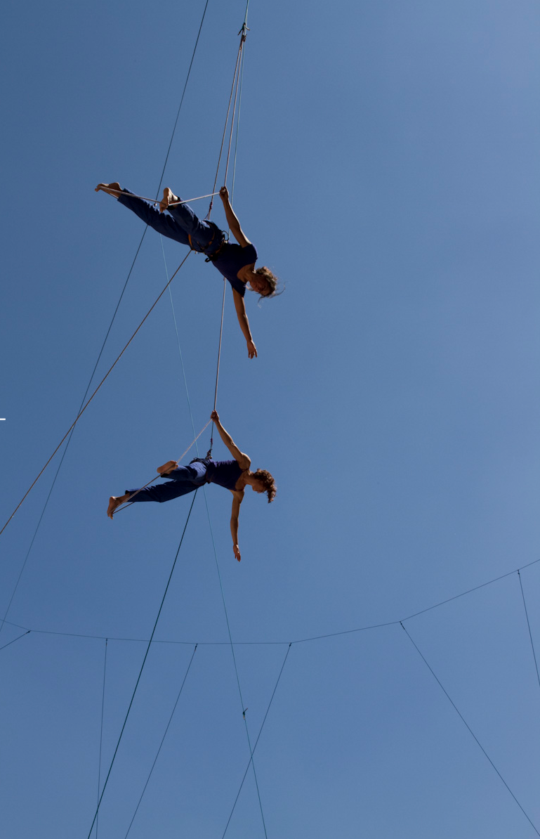 A partir des mouvements dessinés par la chorégraphie, une construction de lignes se met en place dans l’espace. La scène est constituée par un espace public dans lequel est installée une structure légère de cordes. Le mouvement des danseurs au fur et à mesure de l’intervention apparait avec la trace des cordes. Après le passage des danseurs, il reste un dessin des trajectoires emmêlées comme un souvenir qui marquera la mémoire du lieu de la représentation. Ces mouvements construisent une autre vision de ce site urbain et invite à l’imagination.