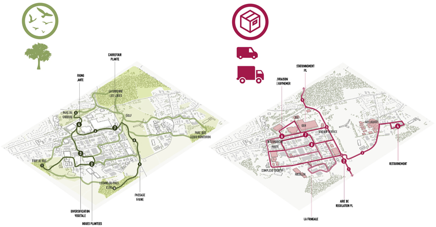 – le développement de quatre logiques de déplacements, pour les véhicules (VL et PL), pour les vélos et les piétons avec la création de parcours adaptés, confortables, surs et directs,
