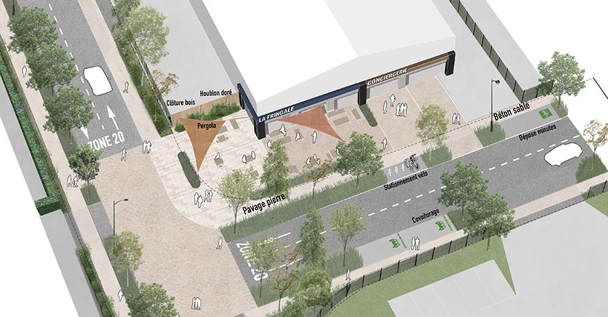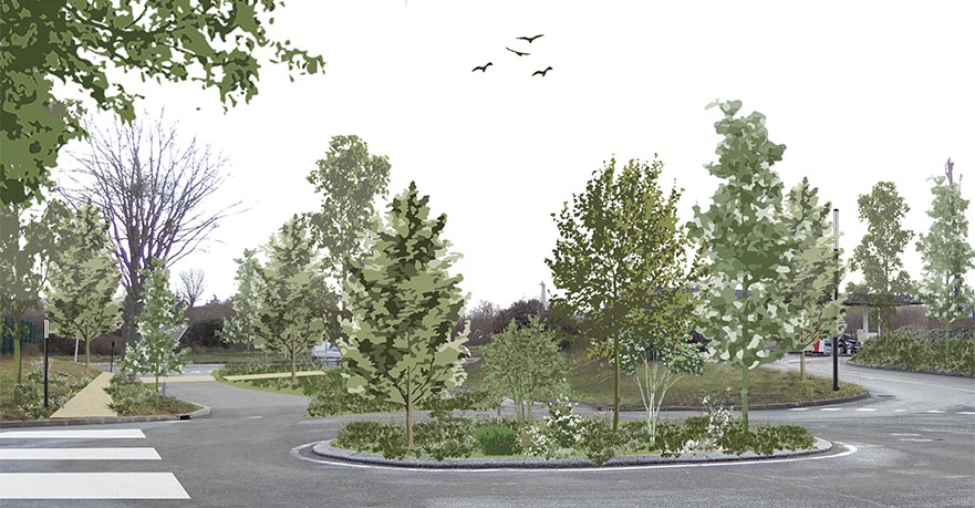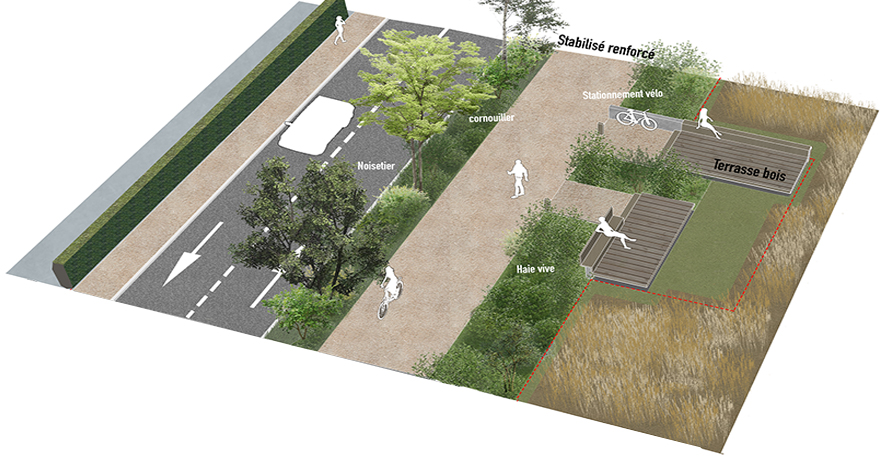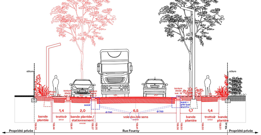 – le traitement des eaux pluviales et le développement de la trame végétale avec la création d’une noue, des plantations sur l’espace public et un accompagnement sur les parcelles privées, afin de servir la faune et la flore.