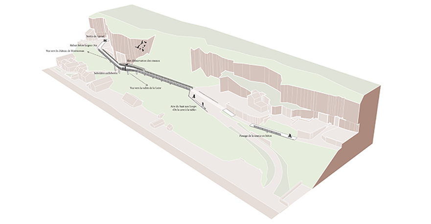 La visite parcourt le relief le long d'une voie qui part du pied de coteau, passe à flanc de falaise sur une fine passerelle, traverse des souterrains, et émerge en belvédère sur le plateau, avec des vues panoramiques sur la vallée de la Loire. La découverte de ces milieux est lente et progressive.