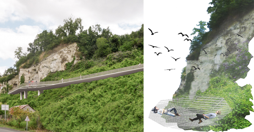 L’itinéraire est ponctué de jalons qui orientent mais surtout soulignent les curiosités à découvrir : des filets pour observer les oiseaux, des socles pour mettre en lumière des singularités, des belvédères pour offrir des points de vue, des aires pour déguster les spécialités locales et des pauses pour la découverte des fontis et de la falaise. L’architecture des interventions utilise des matériaux locaux et un vocabulaire sobre pour souligner les qualités du paysage.