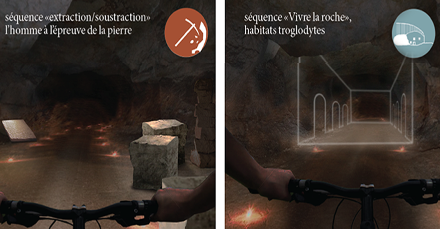 Les scénographies sensibles au niveau des tunnels, situés à chaque extrémité, exploitent la pénombre des tunnels. Des aires d’arrêts permettent la découverte des activités locales. L’organisation de la visite joue sur des perceptions à différentes vitesses.