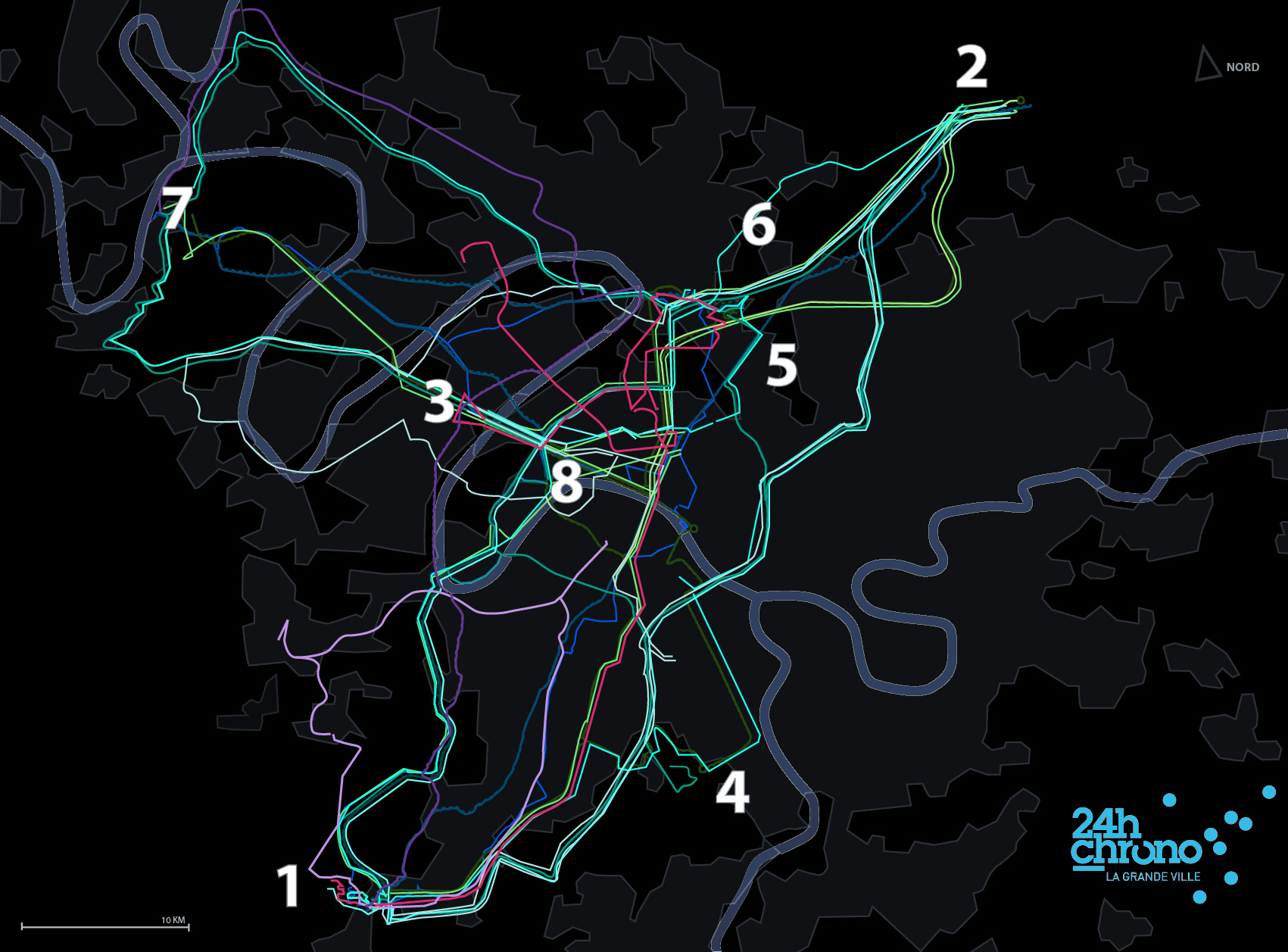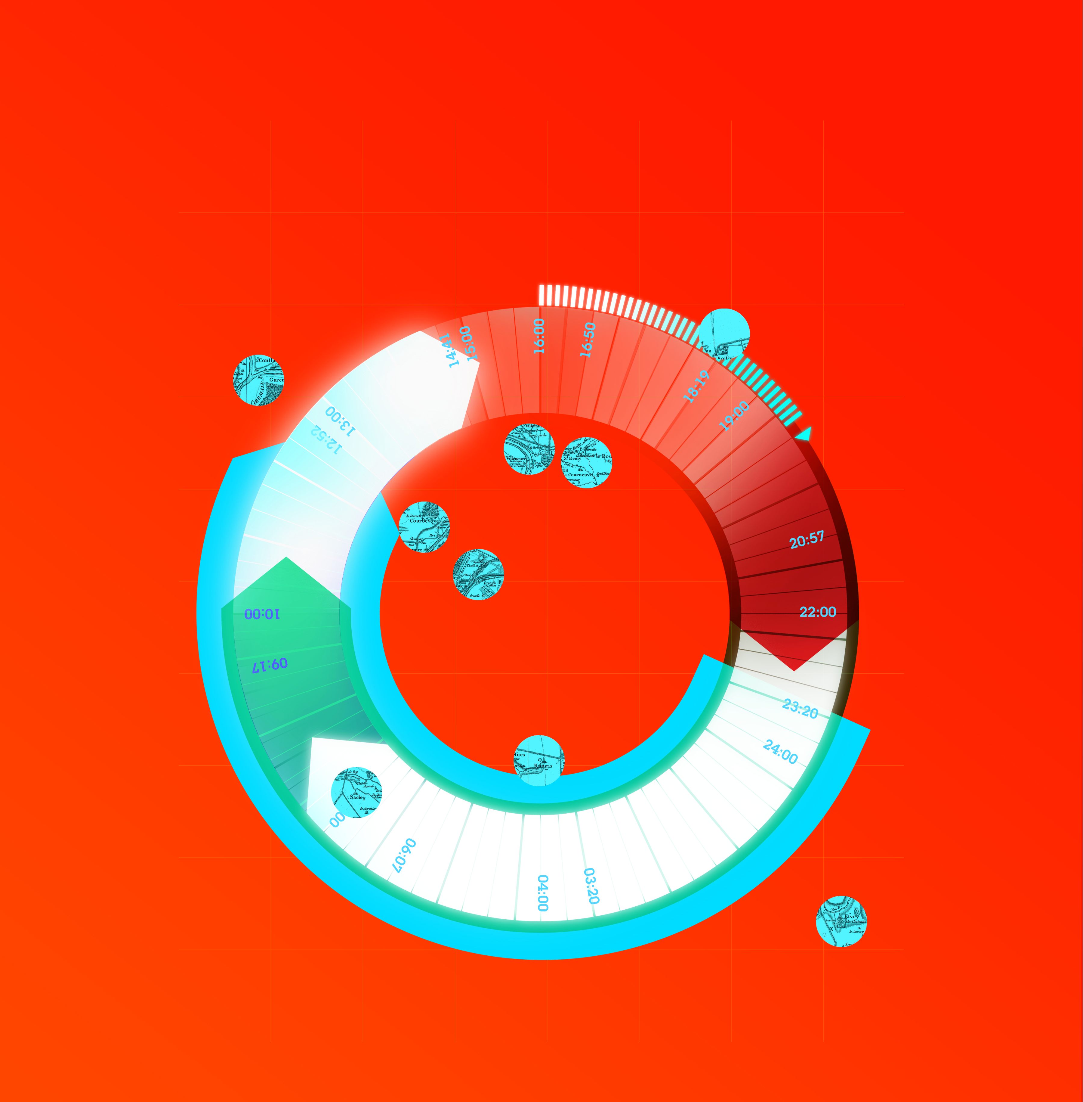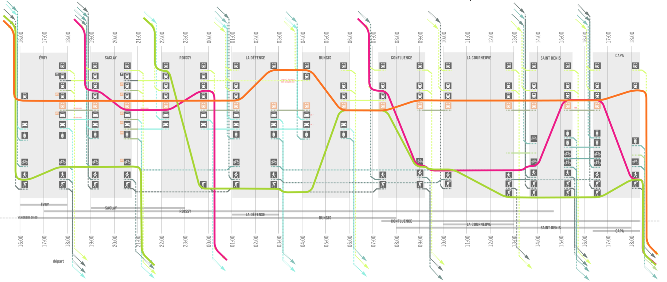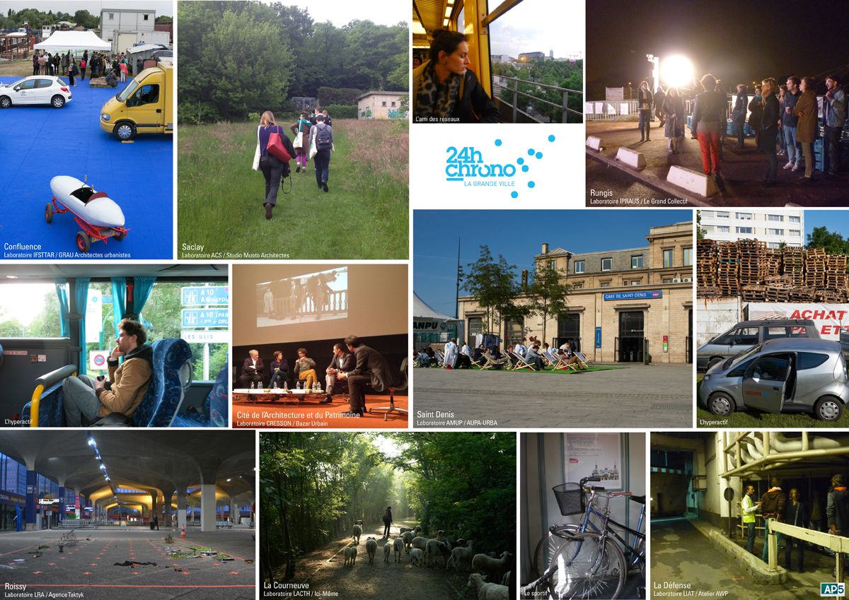 Missionnée par le ministère de la Culture et de la Communication et le Bureau de la recherche architecturale, urbaine et paysagère, l’équipe d’AP5 a été chargée de la programmation, de l’organisation, de l’accessibilité et de la lisibilité de l’événement 24h Chrono sur le thème de la mobilité. La découverte des sites et les parcours d’accès sont des invitations à visiter le Grand Paris. La diversité des interventions sur des sites aux ambiances variées se retrouve également sur l’infinité des parcours pour rejoindre cette « boucle temporelle ». Outre les transports en commun et les autoroutes, les déplacements restent à inventer entre et sur ces sites du futur Grand Paris.