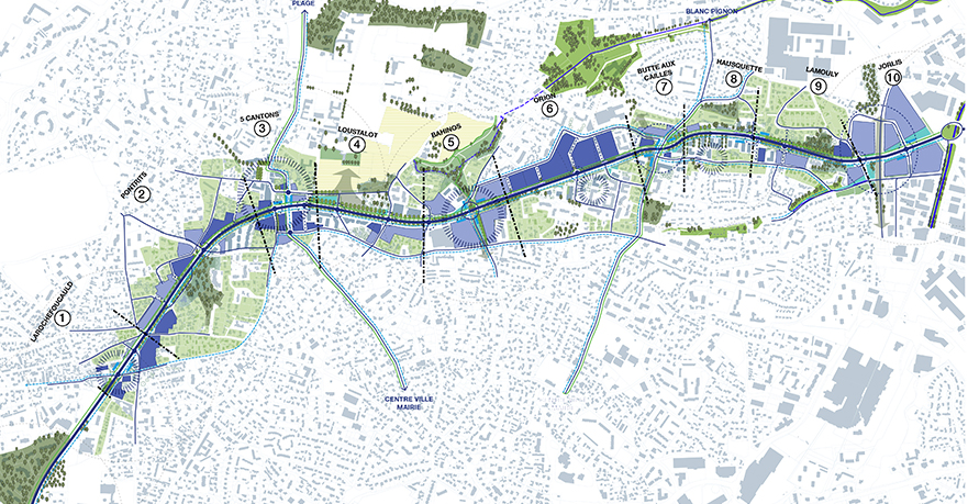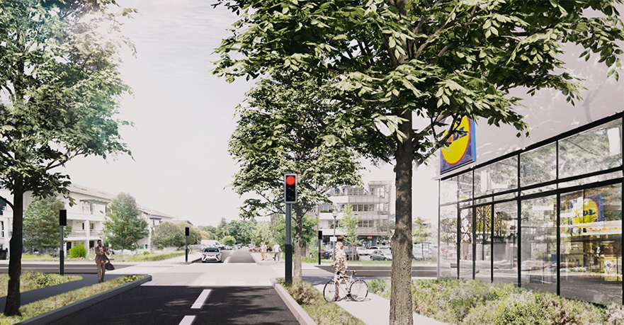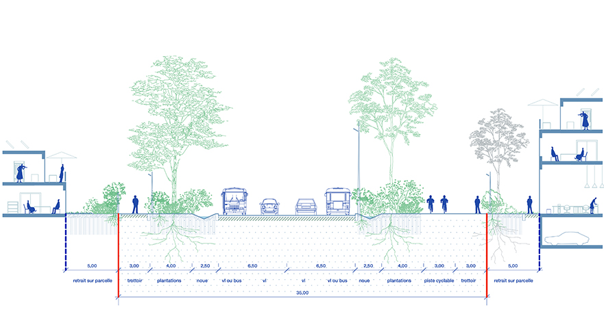 Un nouveau partage de l’espace public est engagé avec les emprises optimisées en faisant la place aux modes doux, à la faune et la flore, l’eau, les transports en commun et la voiture. Il s’agit de rompre avec le développement au coup par coup tout en laissant la place à des initiatives privées et aux exigences liées au réchauffement climatique. Préparer demain c’est déjà préparer la place pour chacune des pratiques en cours de développement aujourd’hui et plus seulement celle des voitures en transit. Plusieurs milliers d’habitants pourront traverser et vivre au bord de ce futur boulevard urbain.