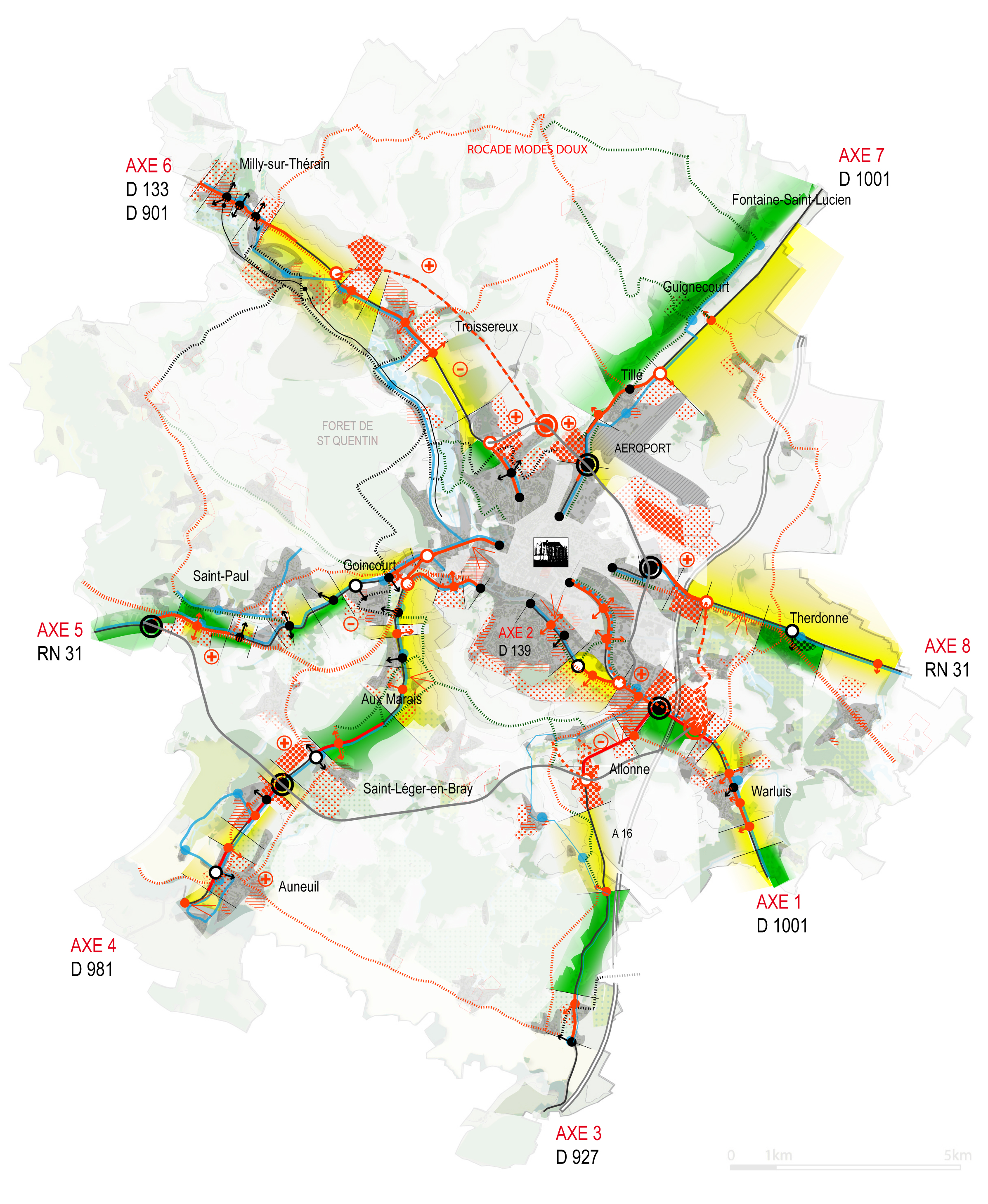 L’étude a pour objectif de définir les évolutions des 8 principaux axes d’entrée de l’agglomération de Beauvais. Elle s’appuie sur une lecture à travers 4 thèmes : les déplacements multimodaux, les horizons-paysages, les polarités diffuses et les particularités locales. Chaque axe est un faisceau d’épaisseur variable constitué de paysages et de voies qui irriguent le territoire traversé.